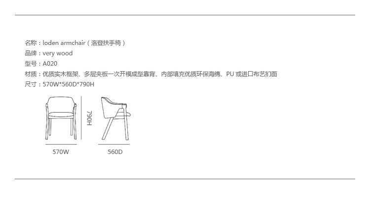 Loden Armchair(洛登扶手椅)最突出的特征是通过前腿和扶手用来创建一个符合人体工程学的功能的接触点,更安全、 更坚实的融合力。坐垫和靠背都是独立的,以确保更容易清洗和快速更换。制作采用优质实木框架、多层夹板一次开模成型靠背、内部填充优质环保海绵、PU或进口布艺扪面,保证极高的舒适度。