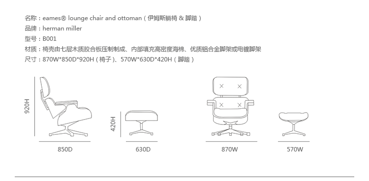 一眼就能看出这是Eames经典的躺椅。被选为主要美术馆的永久珍藏品,也被作为纪录片和书籍的恒久主题,给您的住宅提供优雅的风格和豪华的舒适感。