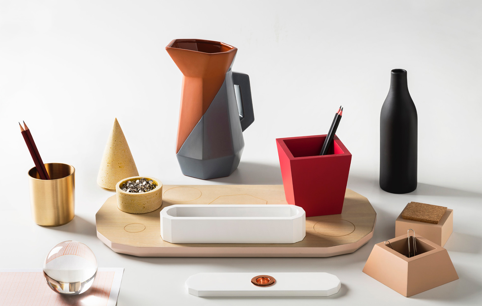 桌面集由一组对象组成,其特征在于使用不同的材料来创建不同的使用形式。 木材和软木的自然性与聚乙烯的当代性质相对应; 陶土的质地与玻璃和瓷器的精致混合。 具有几何形状和温暖的柔和色彩的花瓶,容器,玻璃和镇纸组合成功能性和装饰性。 桌子采用休闲和俏皮的色调。