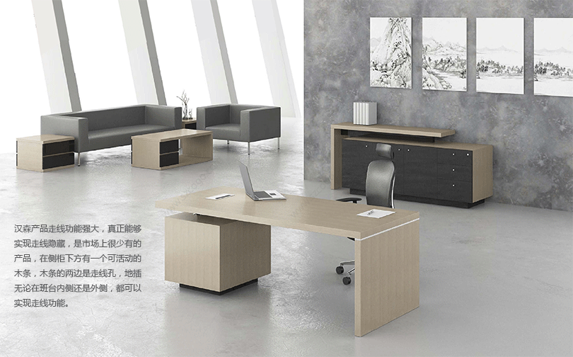 汉森的主要特点是线条粗犷,粗线条透着现代感茶几不拘一格,跳出传统。地柜及文件柜都显示着与众不同的个性,空格式文件柜增添了一种书房里的文人气质,文件柜分为6格空格、4格空格及独立的衣柜,和配套的后地柜,可根据办公室的实际尺寸自由组合,也可搭配一排空格柜,班台后面加地柜