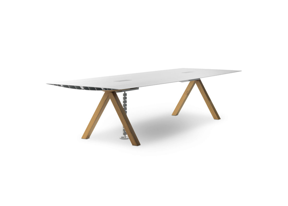 Konstantin Grcic 通过此表 打开了他为 Bd Barcelona设计的Extrusions系列,其洗礼为 Table B。它的名称与设计本身一样简单和技术性。Grcic受到经典Bd件的启发,例如Hypóstila搁板装置(自1979年开始生产),用于开发具有最小轮廓的挤压铝制桌面。最大长度可达500厘米。提供多种表面处理,并提供三种支腿型号。适用于室内和室外区域。其明显的简单性掩盖了高级工程师参与的复杂技术开发。生产过程还包括几个手工过程。结果是一件具有德国设计师所有特色的精巧作品。挤压铝制桌面,银色或亚光黑色透明阳极氧化抛光剂,或根据要求的RAL颜色参考涂漆。上表面可以用天然橡木板和水性清漆完成。支脚共有三种类型:混凝土,不锈钢杆和天然橡木和水性清漆。
