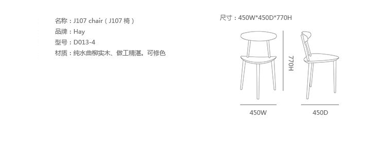 J107是由Poul M.Volther在50代所设计的三脚单椅,使用山毛榉原木制造,另有四种不同色彩黑、灰、白、珊瑚红可供选择。隶属于FDB系列的J107单椅,是HAY在 2011年推出丹麦精典家具复刻版系列之一,当年原本是为丹麦消费者合作社(FDB)所设计的产品。兼具实用和自由设计的概念,就是40年代FDB的家具产品核心概念,藉由规模性的生产,降低成本,FDB系列让设计家具在当时的丹麦不再那么高不可攀的遥远,FDB 系列不但价格亲民,同时兼顾制造的高质量,风味独具的设计更是历久不衰。经典的温莎式造型 (Windsor style),可以说是FDB系列单椅 - J77/J104/J107/J110共同的设计DNA,全木制的FDB系列单椅,椅背由多根直棂构成,通透利落的造型,带出有别于其他单椅的强烈视觉效果,通透的靠背设计,也让整体造型变得轻盈,但底部三只旋木椅脚由上至下向外倾斜挺立,具有轻巧而稳重的视觉效果。J107是FDB系列当中,唯一的一张三角单椅,并且有着造型别树一帜的三角椅面,体积较小却又舒适无比的J107不但适合商业空间或较小的居家空间使用,也适合与其他FDB系列单椅相互混搭,营造高低的层次效果。数十年过后,HAY决定重新生产的FDB系列,除了立基于HAY的品牌精神-期许让丹麦家具设计回归50、60年代的创新思考模式,并赋予崭新的当代内涵。也将FDB系列的经典延续,并且推广至全世界,让世人都能回顾,并且享受型能兼具的FDB。