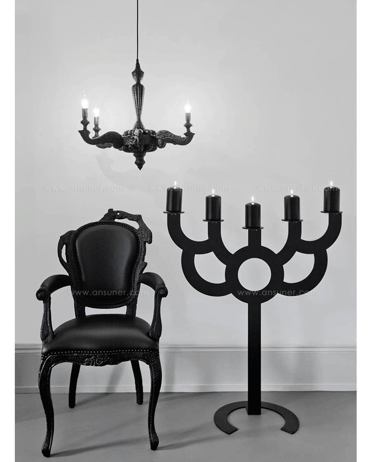 "Pieces of furniture are literally burned,after which they are preserved in a clear epoxy coating.The beauty and character of burned wood is now captured in a long lasting material, creating the strange sensation of sitting on burnt furniture.Maarten Baas is a Dutch designer who graduated from Design Academy Eindhoven in 1996.In 2000 he studied for several months at the Politecnico di Milano. In June 2002 he graduated at the Design Academy a series of burned furniture called "Smoke".Maarten is searching for the boundaries of design,without leaning on the regular"do's and don'ts".The Smoke series includes armchair,dining chair and chandelier. Each item from the Smoke series share the unfamiliar and untamed finish that is categorized by fire.Each piece is unique and may differ due to the process used for production.The smoke chair is upholstered in black leather and has a secret repair kit underneath the seat in case of emergencies."