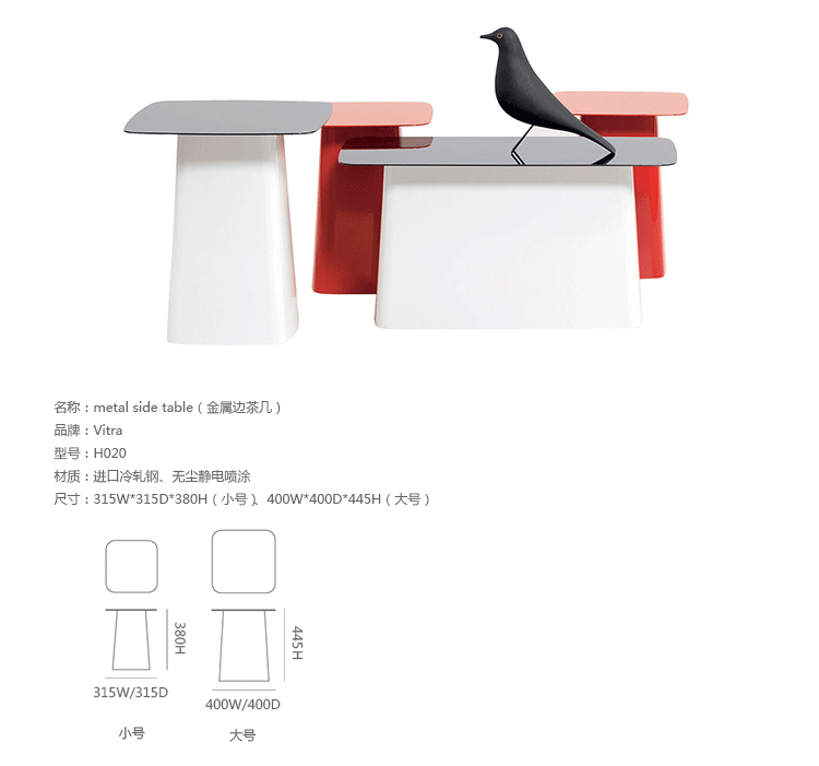 Metal Side Table(金属边茶几)为设计师兄弟Ronan和Erwan Bouroullec为vitra设计的。金属边茶几的设计造型是可长可短的立体柱子,茶托向外扩张,构造出优美的立体空间几何形状。可以放在长沙发或几张椅子前面,非常舒适。您可以将它放在卧室、会客室或是办公休息室,在宽敞的、不拘一格的桌面上,陈列精美的艺术品、新鲜的花、杂志或是专业书籍。