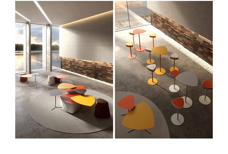 Kastel是一个在室内装饰领域极具影响力的公司,该公司具备高水平的综合生产能力,是一个充满活力的公司。Kastel公司产品多种多样,包括办公座椅,社区座椅和家庭座椅等等。Kastel在对人体工程学进行深刻研究之后,制定了现在的生产线,产品的设计以舒适为主,在生产过程中每一步都严格遵循这一宗旨,为客户提供高性能的产品,满足客户对舒适的基本要求。这也是Kastel公司的经营理念。kensho table(kensho桌)系列桌子采用不锈钢喷涂工艺、做工精湛、三角形脚架,整体造型像盛开的花朵一般,颜色可选黄色,橙色,白色等颜色,多张平凑在一起,宛若一个小小的花园,且与其他家居搭配非常完美和谐,集艺术性与功能性为一体。