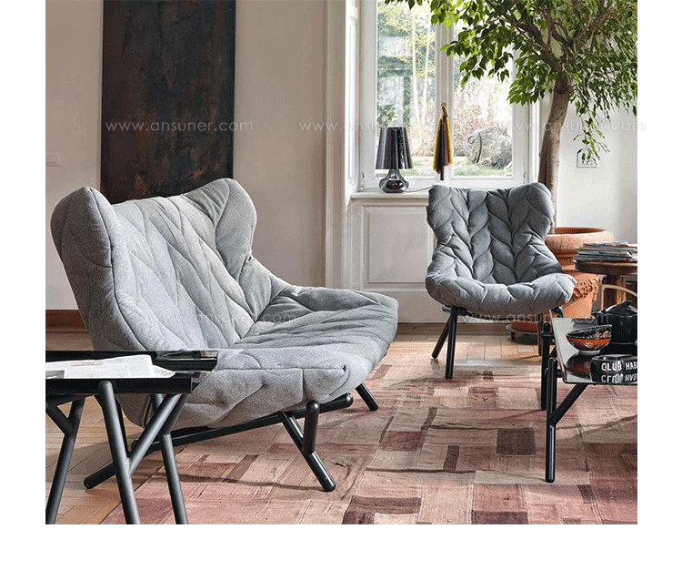 在西班牙鬼才设计师Patricia Urquiola的工作与美学中,大自然与人造是不变的主题,树叶沙发系列很好的表现了她的价值观,柔软的座椅,树叶造型,体现着生态与环保,尤其适合家庭使用。这套家具有单座或者双座,造型非常自然生态︰ 图漆金属框架,舒适的座位,树叶造型缝线,时刻让人联想到一棵枝繁叶茂树。椅面才有舒适的布料或者纤维织物和羊毛混纺,椅脚为环氧树脂喷漆铁管。通过活泼的色彩革新的材料,精湛的缝纫工艺完成了一把具有很高潜在表现力的椅子。