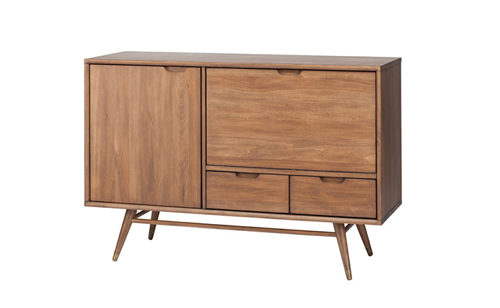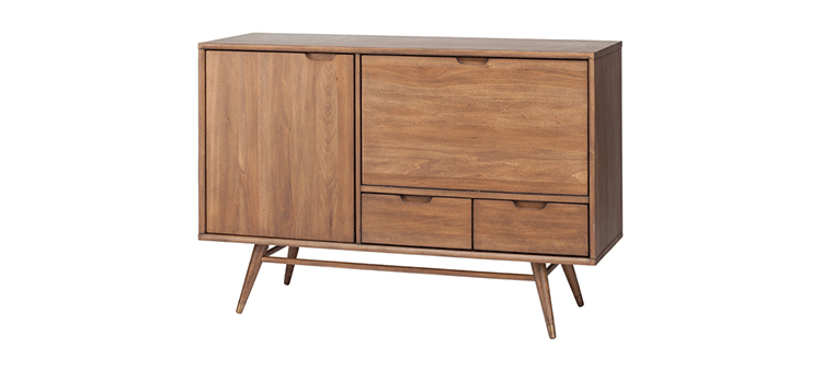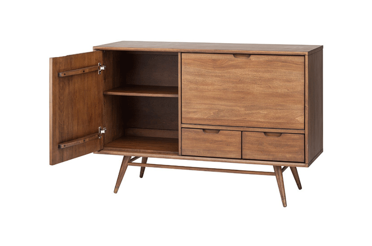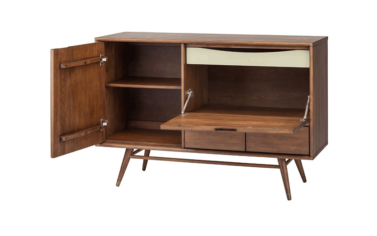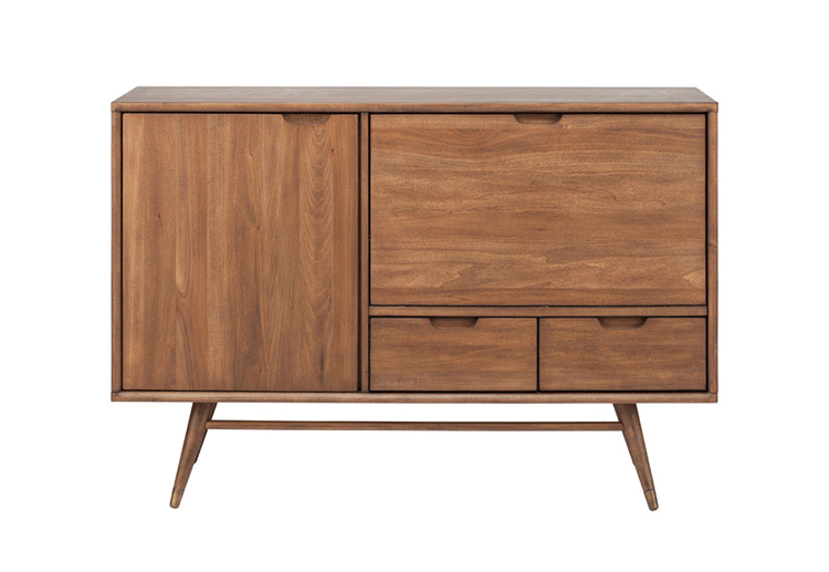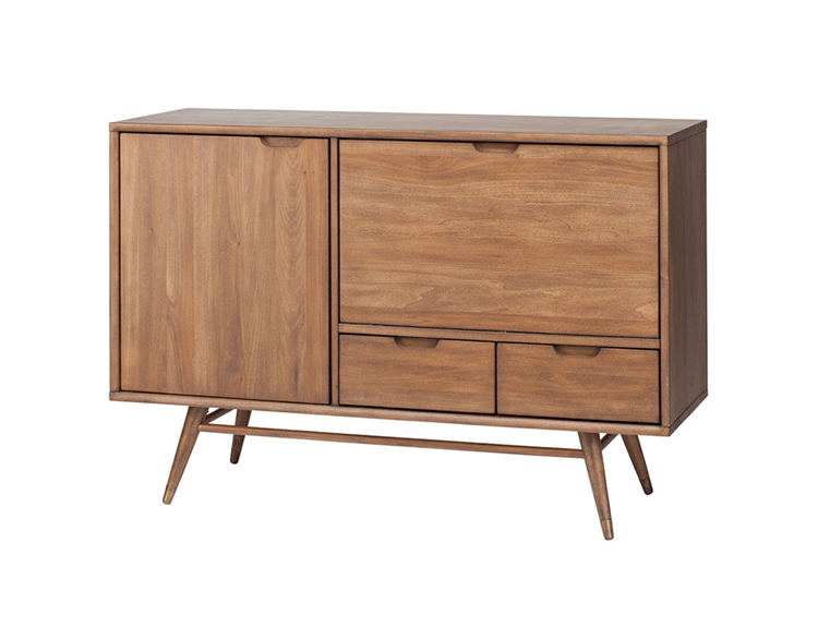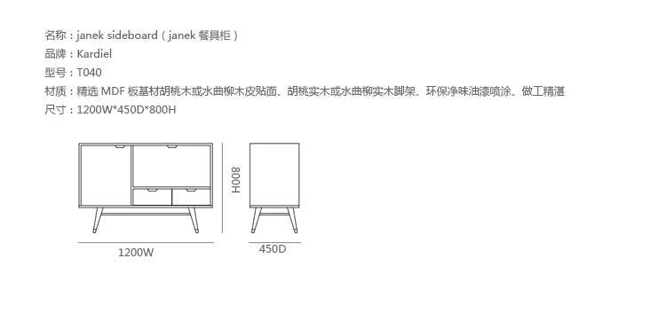 janek sideboard(janek餐具柜)是非常受欢迎的现代斯堪的纳维亚设计,是Kardiel公司制作的经典实木家具,左门具有内部可调式搁板。Finn Juhl和 Arne Vodder 最先尝试胶木和天然木的组合运用。这是大胆的创新,他们结合传统的新鲜的新兴技术与现代主义的概念。制作采用精选MDF板基材胡桃木或水曲柳木皮贴面、胡桃实木或水曲柳实木脚架、环保净味油漆喷涂,做工精湛。