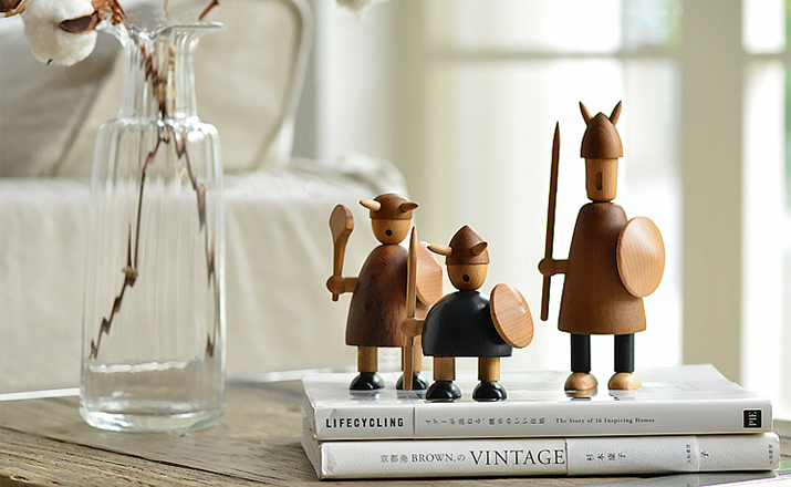 由于50年代的丹麦活跃着一股「斯堪地那维亚现代主义设计」风潮,延续低调简洁的风格并大量采用自然木材与传统工艺所迸出的美丽火花,设计大师Jacob Jensen也致力其中成为见证历史的大师之一。Jacob Jensen Wooden Viking(维京海盗)是经典的北欧形象,随着《加勒比海盗》系列电影的风靡,维京海盗在骁勇彪悍的传统形象里增加了俏皮、温暖、幽默的一面。这一组维京海盗形象为主题的北欧木雕设计,正是基于如此可爱的解读而做,摆在桌面上形成了饶有趣味的场景感,也是用来赠送的高档礼品。