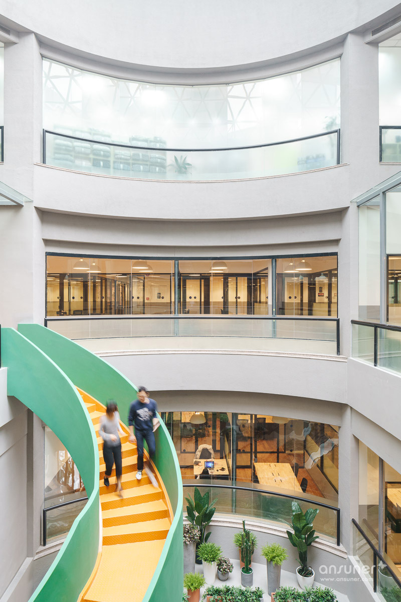 推开双开玻璃大门,一面圆形玻璃穹顶跃然眼前,阳光透过玻璃穹顶洒满整个中庭。为突出中庭的空间感,WeWork设计团队采用了简洁的设计风格,旨在将来访者的注意力集中在沿着中庭盘旋而上的景观楼梯上。充满生命力的绿色楼梯围栏和明亮跳跃的黄色阶梯将二楼和三楼办公空间连接起来。设计团队希望会员能够在使用楼梯的过程中增加互动的频率,与此同时利用雕塑一般的盘旋楼梯设计,避免过于空旷的中庭视觉。