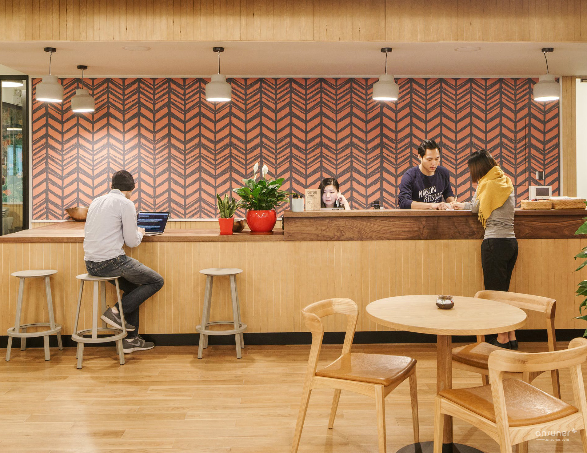 公共空间左侧是一幅本土画工手绘壁画,色彩明快充满张力,不规则变形图案则来自中国新疆地区及古丝绸之路中常见的植物花纹装饰。古丝绸之路跨越了东西方及欧亚大陆文明,衍生出了明显带有不同地域文明的装饰图案,都被设计师通过不同层次的用色,融合在这一壁画中。蓝色及灰色变形字母,则是WeWork所倡导的办公文化:Better Together (一起创造),而在公共空间右边的社区接待处,更是有红色霓虹灯的Better Together字样遥相呼应。